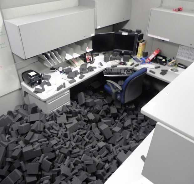-En cubos de espuma. Si alguna vez estás personalizando casos Pelican, mantener la espuma en cubos que desplumar hacia fuera. Barricada de la puerta de la oficina de la víctima, salto de la pared y se llenan de los pedacitos de espuma. Añadir más en los cajones.