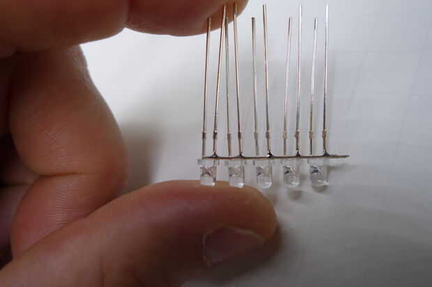 La barra transversal debe poner el plano contra la base de los LEDs y todos los empalmes deben ser agradable y suave. Dan los LEDs menear un poco para asegurarse de que están firmemente vinculados - es mucho más fácil arreglar una junta fría ahora luego después se ensambla la matriz entera.