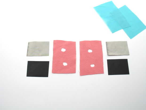 Se usan dos tipos de tela conductora para este proyecto: el gris claro es muy conductivo; utilizado para las acciones de adelante/volumen arriba. El más oscuro no es tan conductora; utilizado para las acciones de espalda/volumen hacia abajo. Cortar cada pieza de tela conductora en dos pequeños cuadrados de 1 pulgada. Usted también tendrá que cortar cuatro piezas de tela: dos para hacer una bolsa y dos para un aislador/divisor entre capas conductoras. Experimento con tamaños de orificio: - demasiado pequeño requiere un apretón duro - demasiado grande y el control remoto puede encender incluso cuando usted no la oprima.