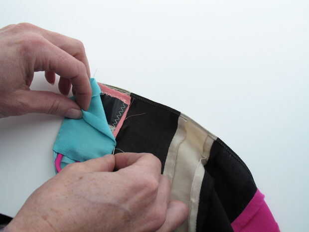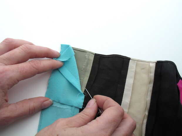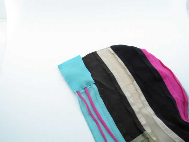 Deslice el conjunto del interruptor conductivo en esta bolsa y séllela. Utilice los dobladillos en el vestido como puntos de anclaje para sujetar los tubos diagonales a tu vestido. También puede utilizar pegamento de tela si lo prefieres.
