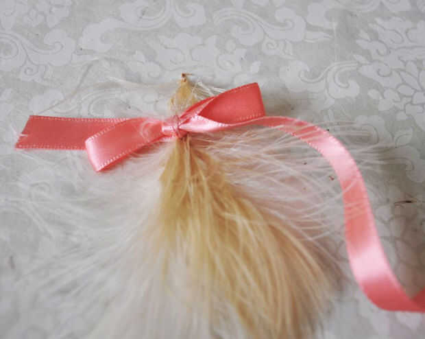 Ate la cinta alrededor de la punta de las plumas en un arco y recortar la cinta sobrante y plumas para un vestido de su gusto. Coloque un poco de pegamento (o esmalte de uñas transparente) alrededor de la parte superior de sus plumas y cinta para fijarlos juntos.