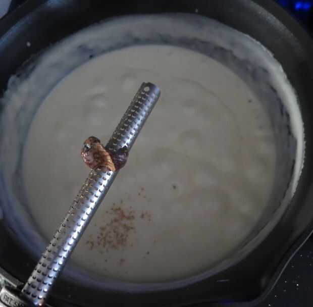 Derrita la mantequilla en una cacerola mediana a fuego medio hasta hacer espuma, incorpore harina hasta combinar, continuar batiendo hasta que la mezcla esté suave y ligeramente doradas, aproximadamente 1 minuto. Poco a poco agregar la leche y crema de leche, subir el fuego a medio alto y batir constantemente para combinar en una salsa suave. Llevar la mezcla a hervir, convertir calor a medio-bajo y cocine a fuego lento hasta que ligeramente espeso, unos 5 minutos, revolviendo ocasionalmente. Añadir una pizca de nuez moscada durante este tiempo.