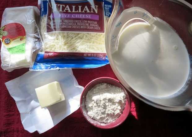 Retire 1/2 taza rallado queso de cinco italianos de la bolsa y añadir a un recipiente de mezcla con 1/4 taza rallado Parmesano, para rematar la tarta al horno parcialmente. Usarás la restante 1 1/2 tazas y 1/2 taza queso parmesano para la salsa Alfredo.