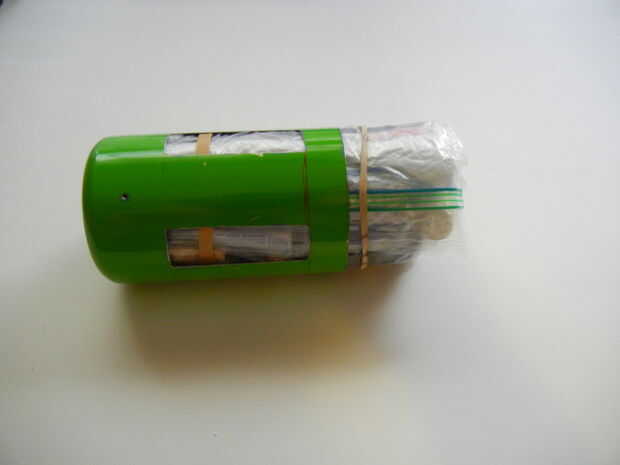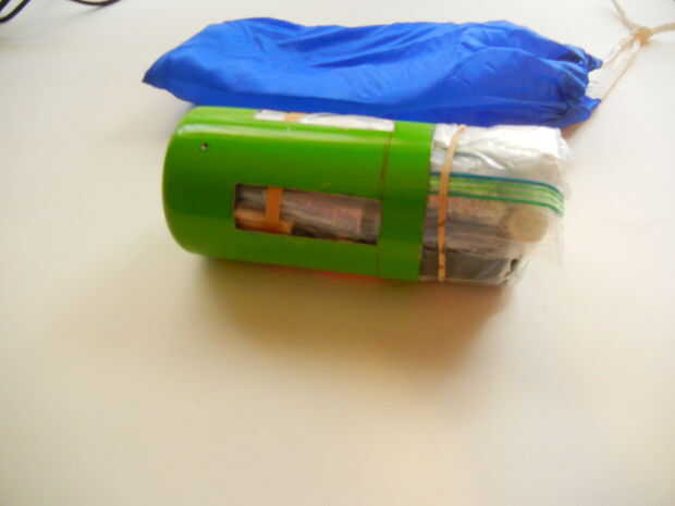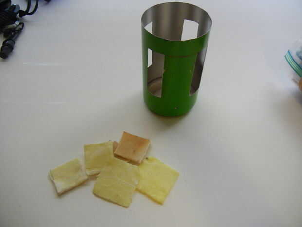 Todos los elementos están dentro de una estufa casera verde, dentro del saco de paño azul. Es dentro de la bolsa porque es más compacto. La estufa funciona colocando ramitas en a través de los rectángulos que se cortan fuera de la botella, haciendo una "x" hacia arriba. Tengo algunos arrancadores de fuego casera en la parte inferior, compuestos por parches de limpieza de pistolas de cera empapada de vela. Nada algodón debe hacer el truco. Encender el motor de arranque, ponerlo en la parte inferior de la estufa, coge todas las ramitas en el fuego. Establecer una poder por encima de él y se puede cocinar. No es útil para hacer más hirviendo una taza de agua y puede no ser ninguna más eficaz que sólo construir un fuego decente, pero requiere solamente un puñado de ramitas para hacer dos tazas de agua a hervir, es mi propio diseño, de todos modos no toma mucho espacio y me gusta. Yo he usado uno antes, que hace un buen trabajo.