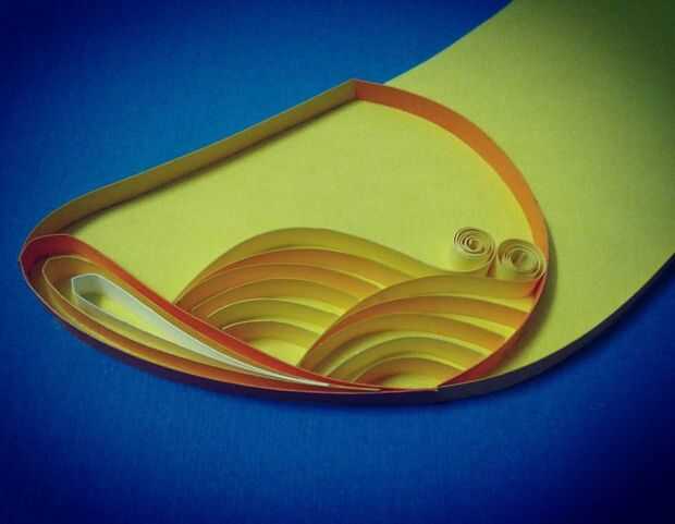Comience pegando las rayas quilling aplicando pegamento a un borde de la raya por lo que la banda está parado verticalmente sobre el papel. Hacer primero la frontera de los peces.