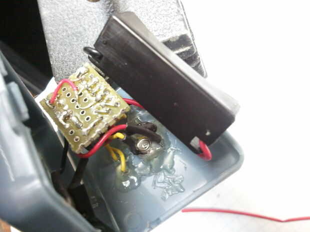 Una vez que todo esté en su lugar designado, podemos pegarlos en. La resistencia variable se ajusta en el agujero más grande en la parte superior, los cables del conector del bloque serán empujados a través de los dos pequeños agujeros, y la toma de audio se ajusta en el agujero grande en el lado. Una vez allí, fijar con pegamento caliente.