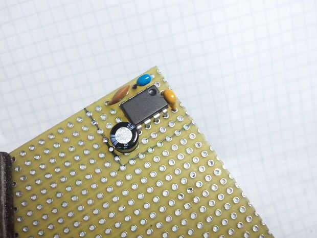 Por favor, preste atención a la polaridad. El lado positivo de este condensador va al pin 5 y el lado negativo será "out". El wire(positive) rojo de la conexión de audio más adelante se conectará a este, pero por ahora, esto también es dejado desconectado.