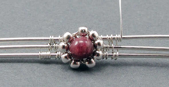 Traer el alambre tejido abajo debajo de los cables de marco otra vez y continuar tejiendo hasta tener otra sección tejido que está alrededor de ¼" de largo, midiendo desde la marca le hizo en el paso 1 de esta lección. Una vez más, recuerde seguir empujando el tejido apretado con sus uñas.