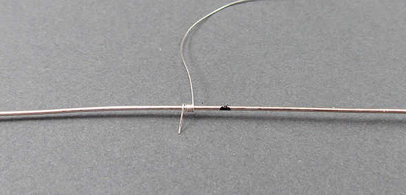 Corte 2' pieza de alambre de 28g y envolver alrededor de uno de lo 20g cables cerca de 5 veces aproximadamente ¼" de la marca.
