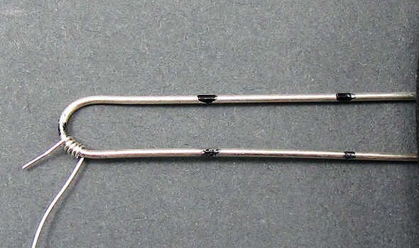 Envuelva un extremo del hilo que teje alrededor de la "U" del alambre 20g. 4-5 vueltas es suficiente.
