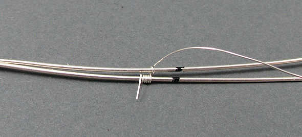 Coloque un segundo cable de 20g al lado del primer. Traer el cable de 28g entre los dos cables de 20g y luego hacer 1 completa envoltura alrededor del segundo alambre.