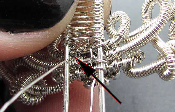 Inserte el cable tejido en la parte posterior de la focal entre los alambres del marco de la primera y la segunda otra vez y dentro de los cables del manguito.