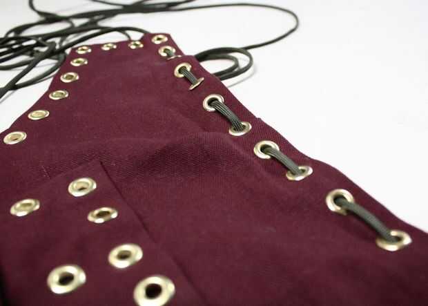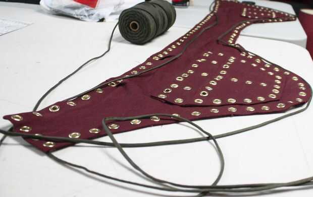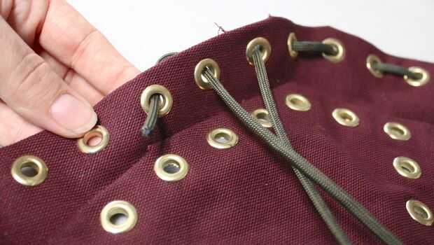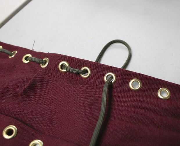 Me sentí como cordón algún cable a través de los ojales del borde, así que medir y cortar una longitud de cable que haría el viaje a través de todos ellos. Lo otro a añadir es unos bucles de cuerda en la parte inferior que puede colgar otras herramientas (como un martillo). Hacerlo con el cable decorativo que funcioné a través de todos ellos habría hecho manojo en otros lugares, así que tomó longitudes cortas y atado bien extremo detrás de ojales tres o cuatro apart.