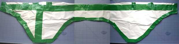 Una vez que se puede quitar, limpiar las líneas, cortar la forma y ponerlo otra vez. Repita el proceso, hacer modificaciones, añadir dardos, plegables, etc.. Si encuentras que has cortado demasiado en un lugar, ahí otro pedazo de cinta y modificar. Enrollar con gravemente desordenado buscando papel patchwork da forma final de este paso, pero cabe exactamente derecho. Como el papel es bastante propenso a desgarro, una vez que estoy cerca, usaré cinta adhesiva para reforzar los bordes. Este es un patrón áspero; a limpiar cosas para arriba en el paso siguiente.