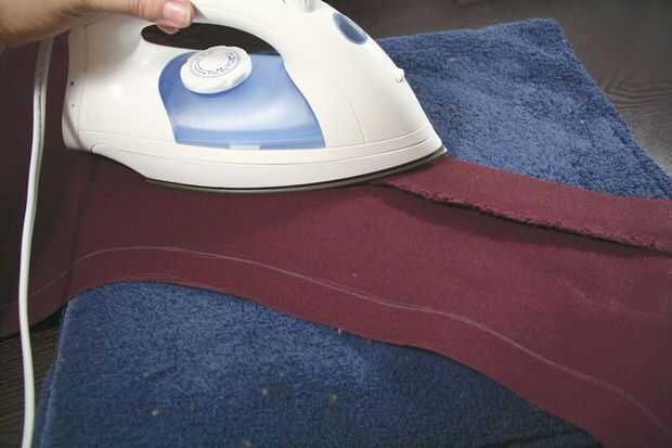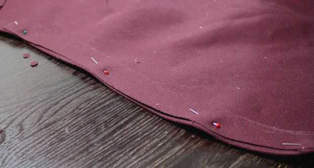Mantener a la tela con el lado equivocado de lado/marcado. Ya que no quería que la tela a desentrañar en los bordes, tomé esa pulgada extra de tela alrededor de la línea del patrón y había doblado encima. Una plancha es útil aquí para permanecer en el lugar, y sobre todo si trabajas con tela pesada. Como se puede ver en las fotos, mi patrón tiene un montón de curvas, por lo que tenía que hacer algún trabajo para conseguir ese margen a doble plana.