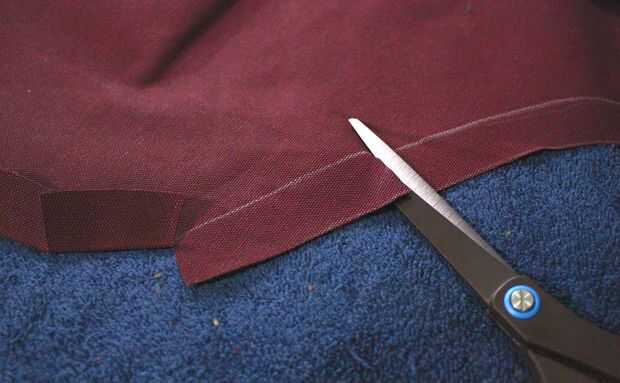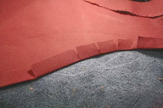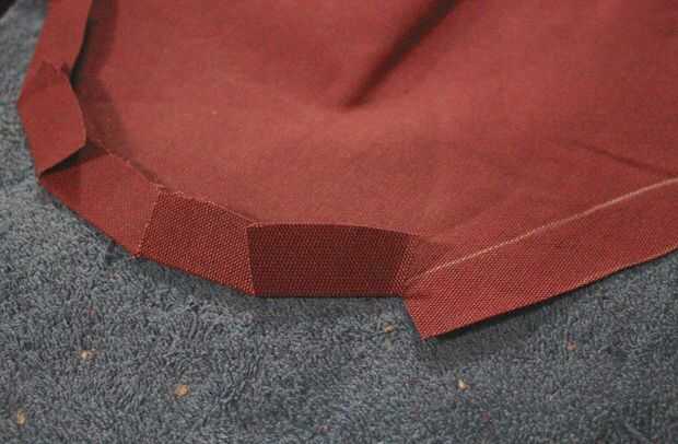 Lo que he logrado esto fue hacer rajas periódicamente y pliegan las aletas para que la curva podría mentir plana. Para ayudar a apoyarlo, corté tiras curvadas de la tela sobre una pulgada de ancho que siguió el borde curvado de la tela, entonces cubrió encima de las aletas dobladas.