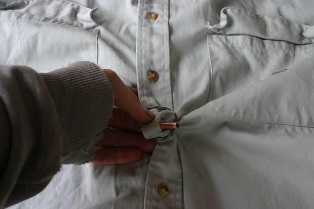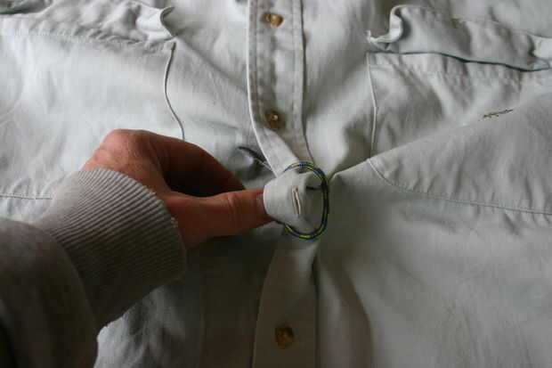 Alimentar el ojal y la tela circundante a través del bucle de cable de del rompecabezas ojal.  Tire lo suficiente a través de insertar el extremo opuesto de la tubería en el ojal.  Para hacer el rompecabezas más difícil, pregunte a la víctima para no ver este paso.