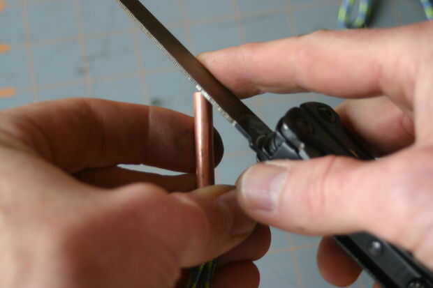 Suavizar los bordes exteriores e interiores de la tubería.  Utilizar un archivo seguido por papel de lija.  Si el papel el papel de lija en un cono de forma obtiene el interior muy bien.  Nota: en las fotos que los puzzles son ensamblados, debe alisar ambos extremos antes de armar el rompecabezas, justo se me olvido tomar fotos hasta después de salas.