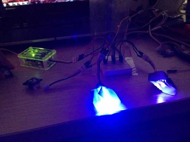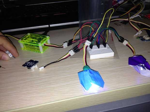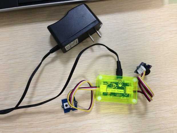 A continuación, conecte les como foto 2. Pero lamentablemente me quede sin Grove - rama... y quiero más LEDs! Así que tomé un mini protoboard, algunos LEDs y algunos cables de puente para el proyecto. Que enrutan el poder de Grove - DC Power Jack a mini protoboard y 3 LEDs paralelo.