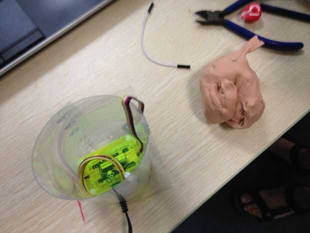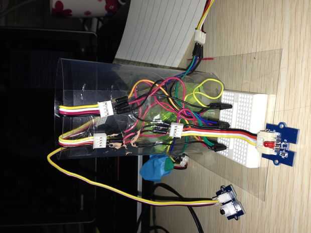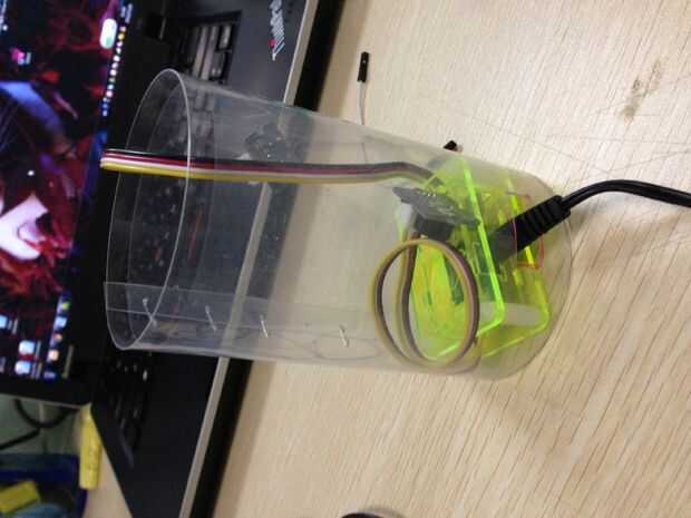Después de eso, puse las tripas en el rollo de PVC y había pegado el mini protoboard en la base con cinta adhesiva.