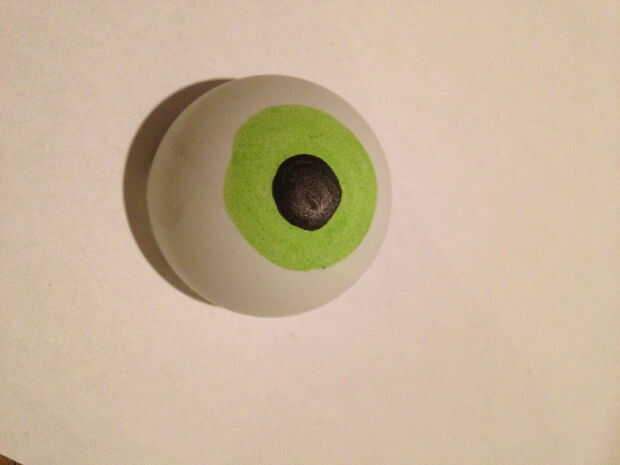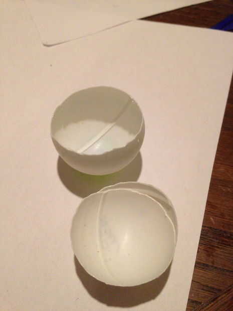 Cortar las bolas, pero no en mitad. Que una parte sea mucho más grande que el otro, cortamos las bolas para poder poner algo adentro y necesitamos los bordes a los ejercicios los agujeros que ayuda a controlar los ojos.