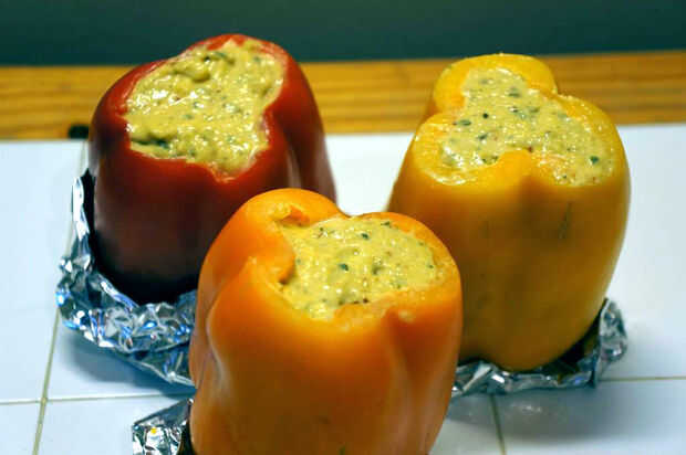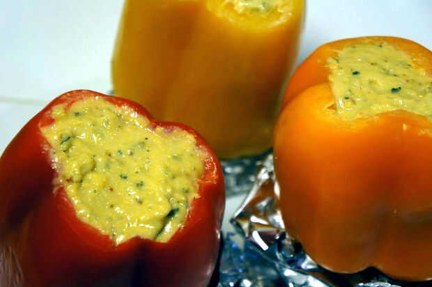 Rellenar los pimientos con la mezcla de arroz, alternando con el resto de la mezcla vegetal crudo 3/4 el camino completo.