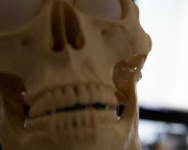La mandíbula probablemente ha caído por ahora; Tomemos un momento para solucionarlo conectando el lado derecho del cráneo. Tomar la mandíbula y pop de los cartílagos de silicio en el lado derecho. Utilizar el taladro de nuevo poner un agujero en el punto más a la derecha debajo de donde estaba el silicio, luego taladre un pequeño orificio en la parte superior del silicio. Necesitaremos un agujero más donde se conecta la mandíbula con el cráneo, así que adelante y perforar uno allí. Ejecutar algún alambre de montaje a través de esta serie de agujeros (con el pedazo de silicio en lugar) y atar en cada extremo para que la mandíbula se fija al cráneo, pero lo suficientemente suelta para moverse arriba una abajo.