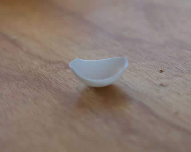 Por último, necesitamos algún material del ojo. Corte el ping pong los materiales en una forma que cabrían en el zócalo del ojo, como una lente de contacto. Esto puede tomar varios intentos, pero una vez que una buena forma puede poner pieza sobre la otra pelotita de ping pong y utilícela como una plantilla.
