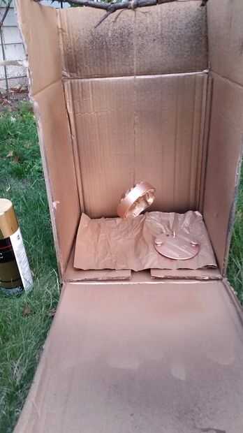 A continuación, pintar el frente y parte posterior de la luneta con finas, superposición de capas de pintura en aerosol oro. Usted puede eligió a primer la superficie, pero encontré esto innecesario. He utilizado por lo menos 8 capas finas de pintura, permitiendo 10 minutos entre que se seque, luego colocar de nuevo las partes. Colgar la parte frontal del bisel dentro de una caja con dos palos (uno largo encima de una caja) y otra pequeña dentro del bisel rinde los mejores resultados. Sólo asegúrate de que puedes pintar el interior de las tapas del"ojo", pero no el interior del bisel, que debe haber con cinta de.