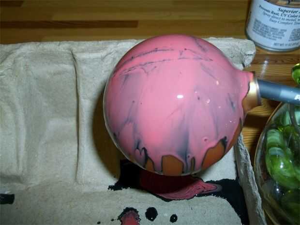 Gotear la pintura mezcla negro y el agua en la parte superior del lado de la esfera, como se muestra. Utilice un pincel para coaxial las gotas uniformemente alrededor de los lados. Gotear la pintura estratégicamente. El resto de las capas de pintura tienden a seguir su capa, así que asegúrese de que el área esté bien cubierto.