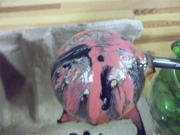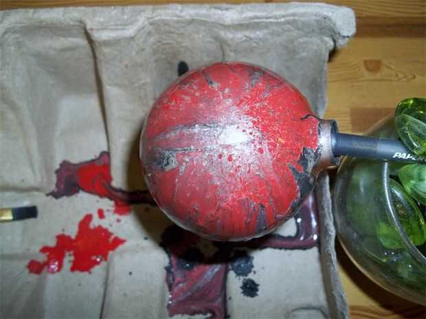 Dependiendo de qué tan bien esta trabajado, puede ser satisfecho. No era, sin embargo y goteó otra capa de pintura roja y negra, justo donde se necesita. Arremolinaba con la pintura en aerosol oro. Puede que necesite jugar con él: un chorro de oro aquí, algún rojo o negro hay alternancia de capas. Una vez que estés satisfecho, pie y deje que se seque completamente. Las pinturas se comportan mal a unos a otros mientras están húmedas así que está totalmente seco antes de pasar.