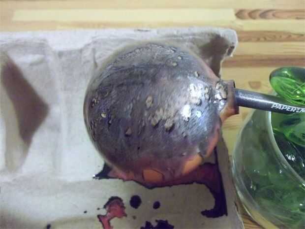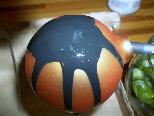 Teniendo el ornamento en esta posición, rocíe inmediatamente con pintura en aerosol oro, dirigiendo el chorro en el centro y rociar en ráfagas muy pequeño. No necesita mucho. Inmediatamente creará las rayas en las pinturas negras y rojas y luego gotear los lados así.