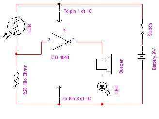 Tan pronto como LDR se pone oscuro el voltaje de entrada de la puerta no cae 1/3 de la tensión de alimentación y el pin 2 es alta y se activa el LED o zumbador, que está conectado a la salida.