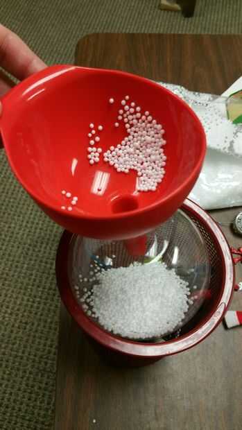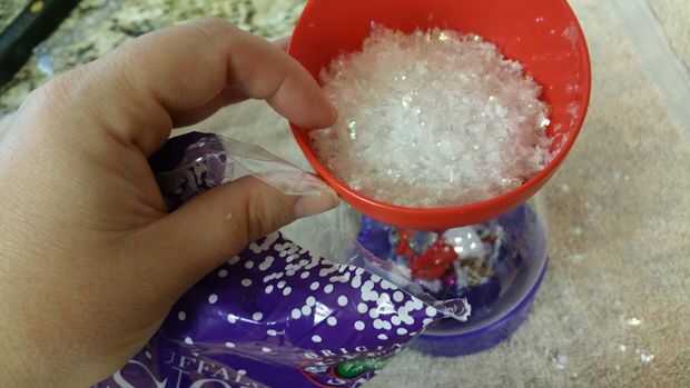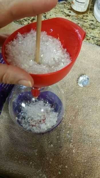 Utilizando el embudo, añada los copos de nieve al ornamento. Las escamas de buffalo tienden a grupo, que tal vez necesite usar un taco para empujar a través del embudo. Nieve de espuma de poliestireno no tiene este problema, pero algunos de los objetos más pesados pueden permanecer enterrados en él.