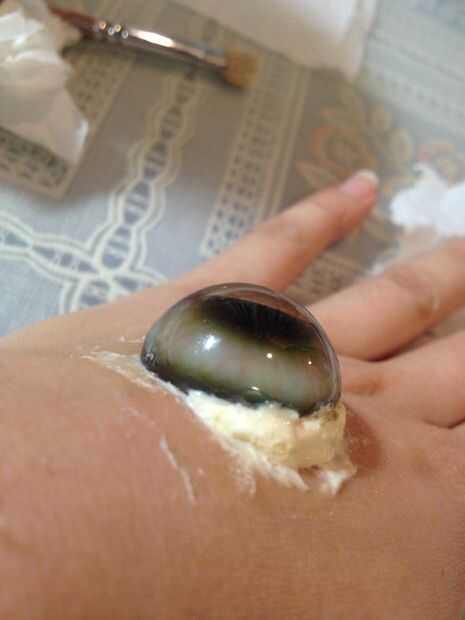 Luego, toma el ojo de la taxidermia, cepillo algunos látex en la parte posterior de la misma y pegar en la mano. Si no pone plana, algunos pequeños trozos de tejido y materia en el espacio, cubrir con el látex. Esto hacer una base agradable incluso para los ojos y asegure a mano.