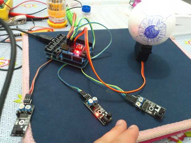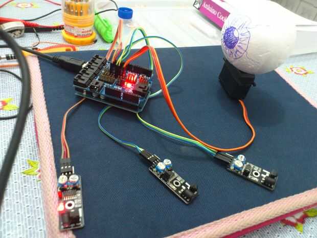 El ojo funciona como sigue: para detectar un objeto frente a cada sensor (hasta 40 cm, ajustable), los cambios de sensor del estado a la salida de Hi Lo (de 5volts a cero) entonces la Arduino dan cuenta de que había un estado de cambio en uno de sus puertos por lo tanto, según el software, el servomotor para girar el ojo a la posición preestablecida.
