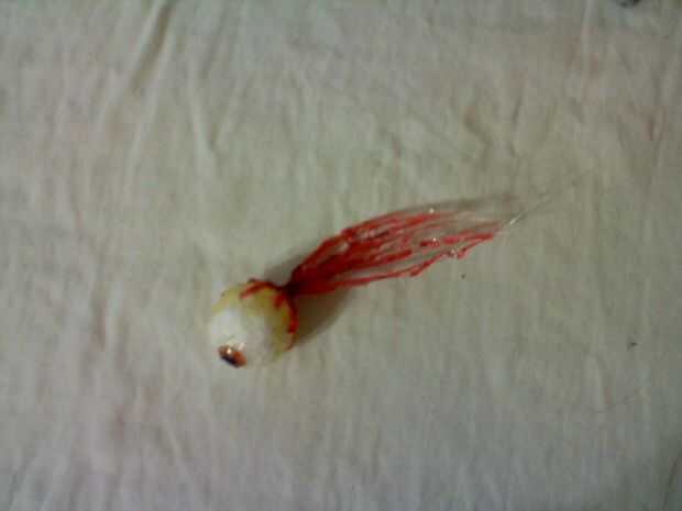hice algo falso de la piel, usando un molde de masa de juego y una mezcla de la gelatina hecha en casa, para cubrir mi ojo. Luego se une la piel con papel higiénico y látex líquido. Luego maquillaje, sangre y hecho!