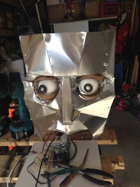 Hice los paneles laterales de la cabeza más grande que el patrón. De esa manera que envuelven el 3D impreso marco de ojo. Me perforó un par de agujeros y utilizar tornillos de rosca chapa para fijar los paneles a la parte posterior del bastidor impreso 3D. También hizo un soporte en L y al frente de la cara el marco impreso 3D justo en el borde exterior de los párpados donde se fijan.