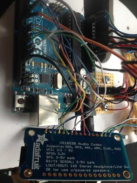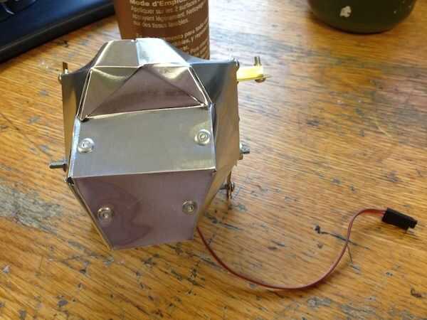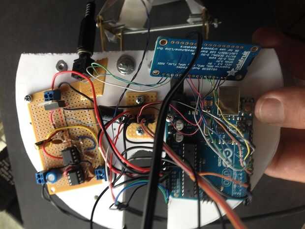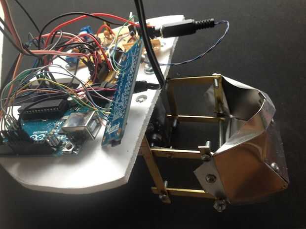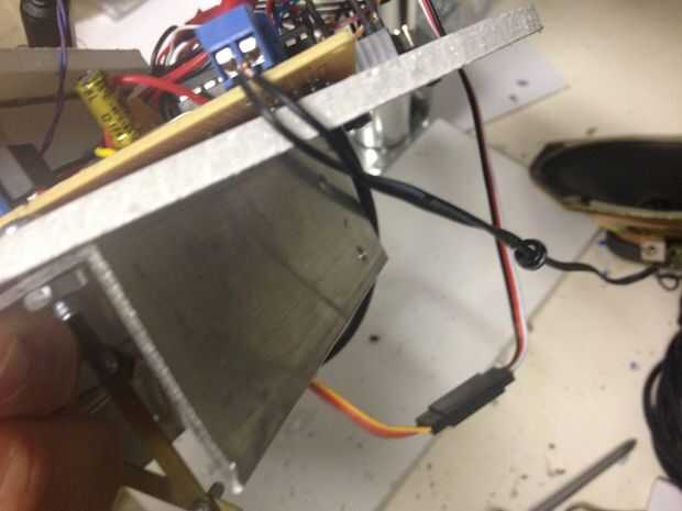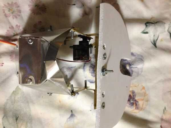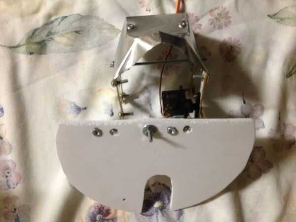 El mecanismo fue atornillado sobre una pieza de aluminio de ángulo. Luego el espuma base semicírculo que tiene la electrónica fue atornillado al aluminio ángulo así. La cosa entera fue unida a la varilla de soporte de pvc con 3/4 uno mismo-perforación dos "tornillos de tecnología.