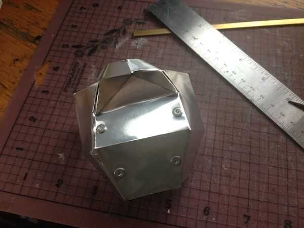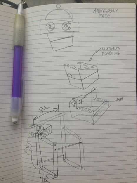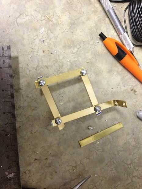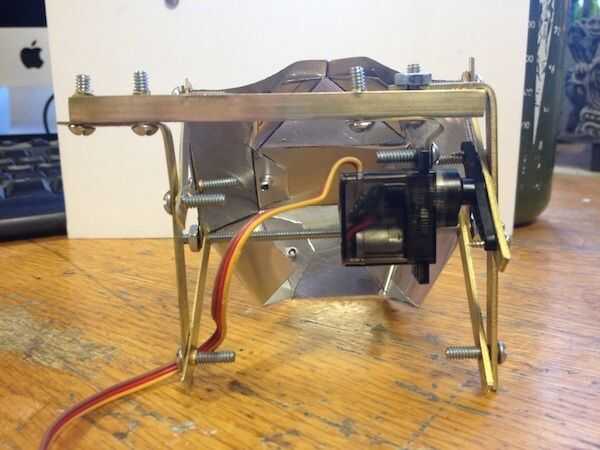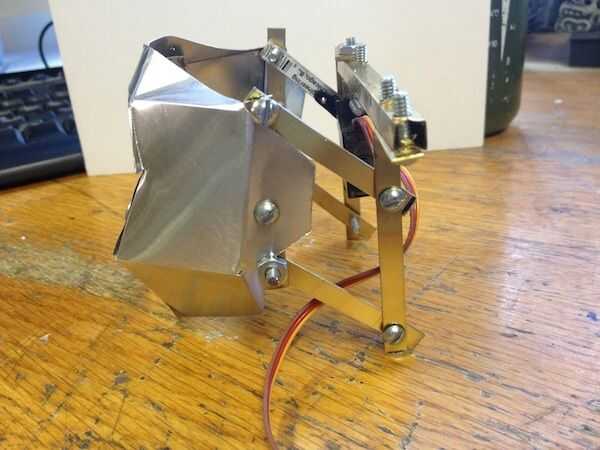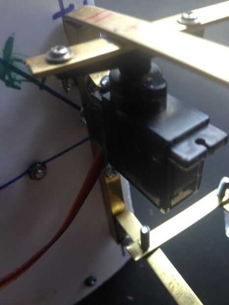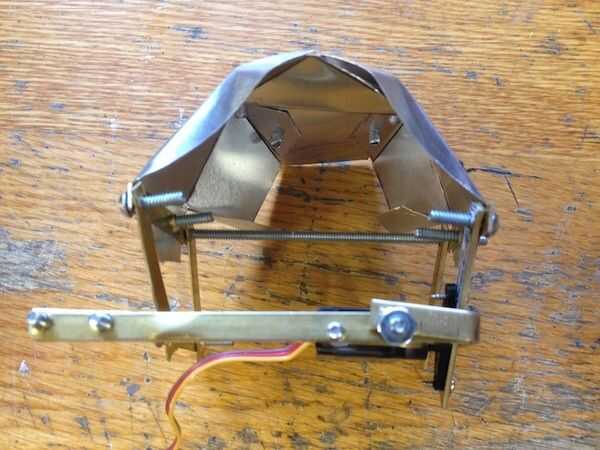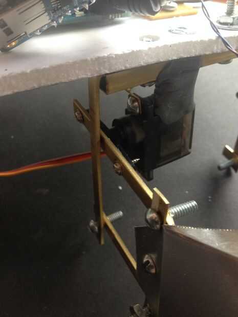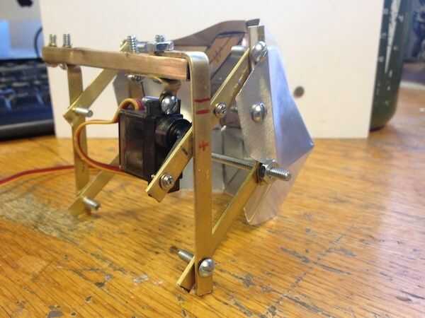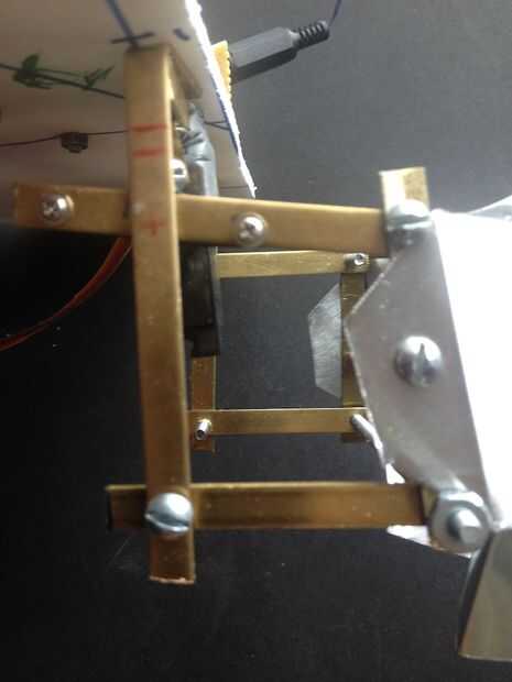 Hice un boceto (primera imagen) del mecanismo. Tengo un poco de bronce en la tienda de hobby. Es fácil de doblar y de perforación, y se ve cool. Se puede ver que el mecanismo es un paralelogramo. El servo se une en el punto de pivote superior de un lado. El latón es aprovechado para tornillos 6-32 por lo que las tuercas no son necesarios. He intentado fotografiar una variedad de ángulos.