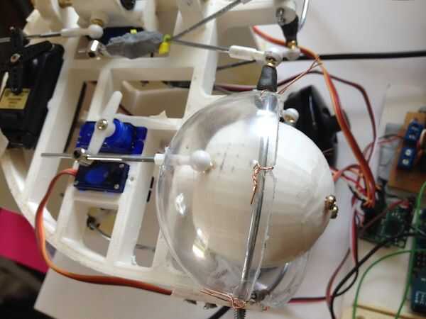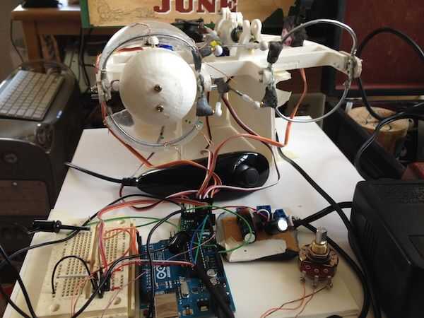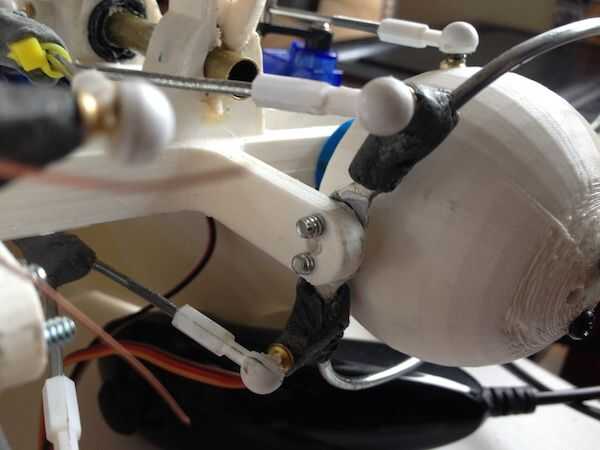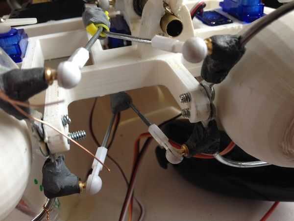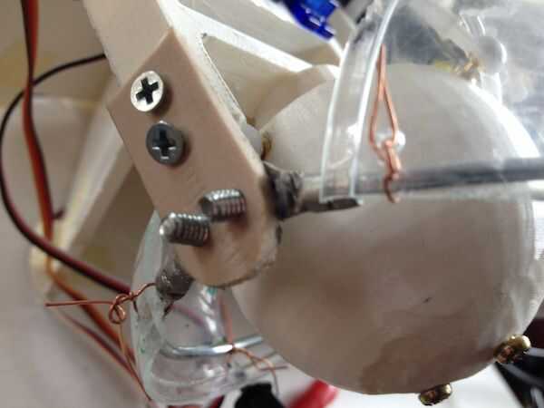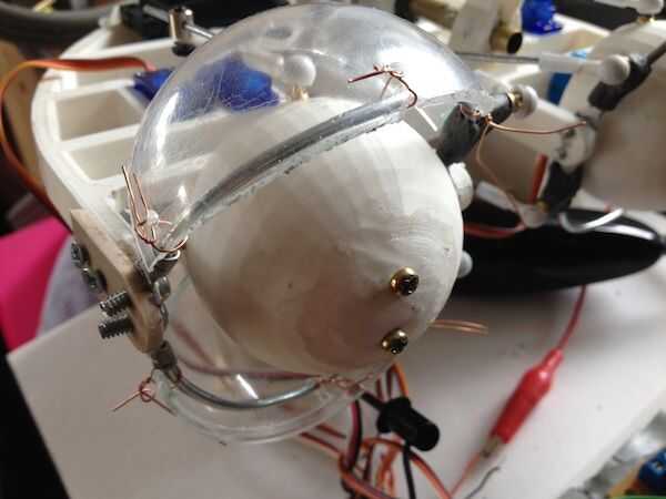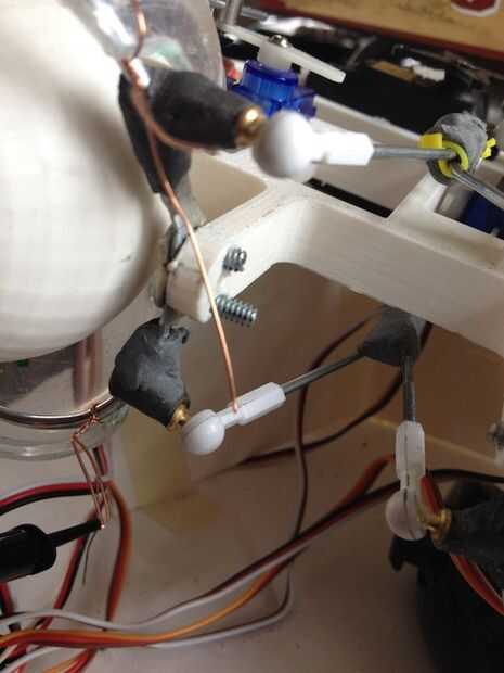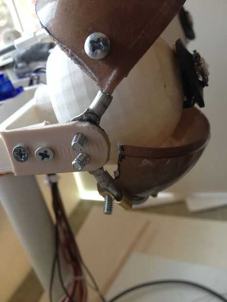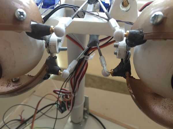 Usé masilla epoxi para unir dos barras de control en una sola barra para el control de servo de párpado superior e inferior. Masilla de epoxy también se utilizó para crear los accesorios para la bola y enchufes conectados a los cables del párpado.