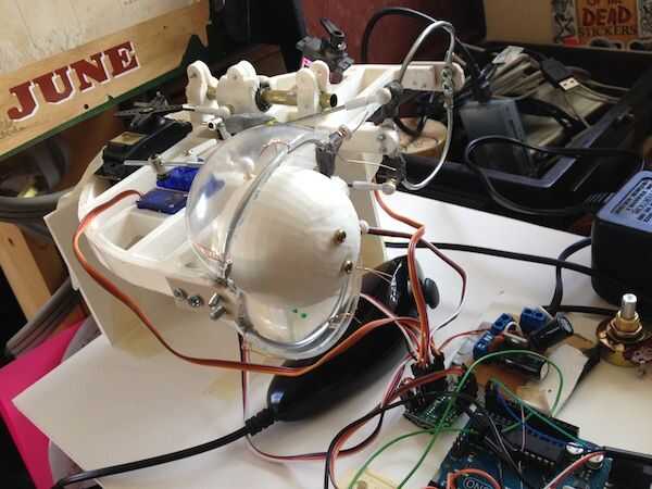 Encontré que un servo de 9 gramos no era lo suficientemente potente como para mover el mecanismo de abrir y cerrar de párpados. Usé un servo estándar en su lugar. Era fácil de dremel a un soporte y el servo encajan perfectamente en el mismo lugar.