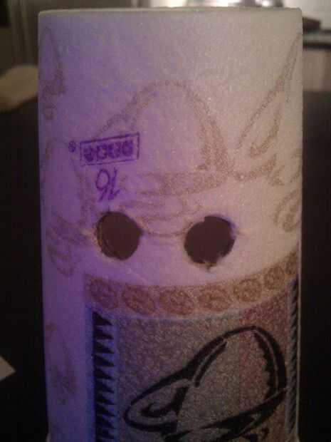 1) corte o perfore los dos orificios de 3/4 del camino a la cima si la Copa es para arriba-lado-abajo.