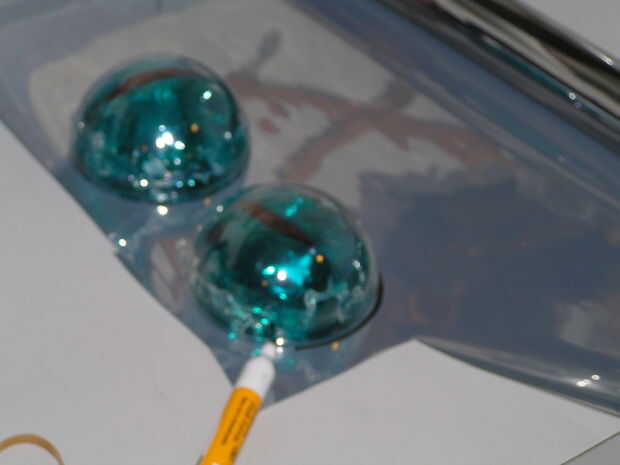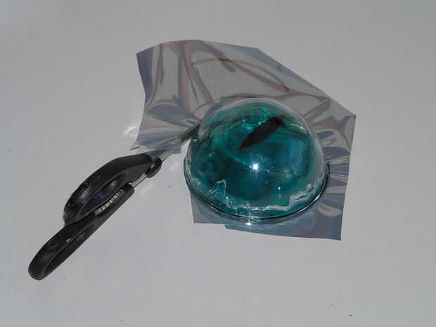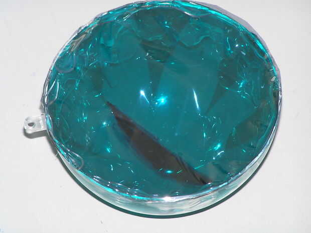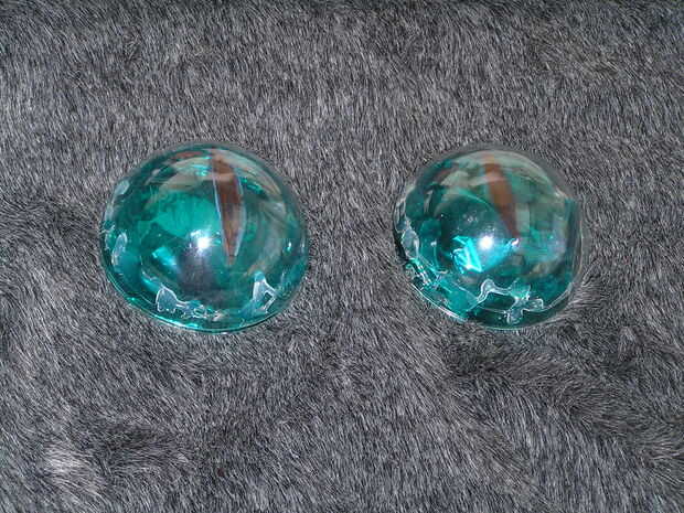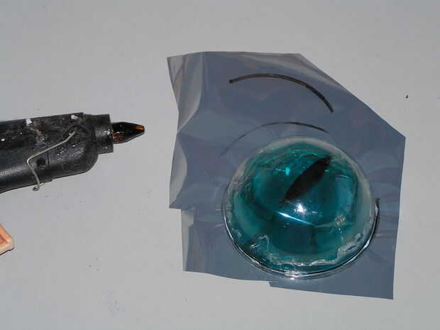 ¿Ver las líneas onduladas destacado feo de pegamento alrededor de los bordes de las esferas de plástico, en la foto final? Si se pueden hacer las líneas onduladas de hotglue más squigglier, lucen como naturales las marcas en el iris. Incluso si usted no puede, que van ser bien ocultos, una vez los ojos están en los contornos faciales y así general de una cabeza de fursuit.