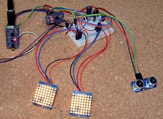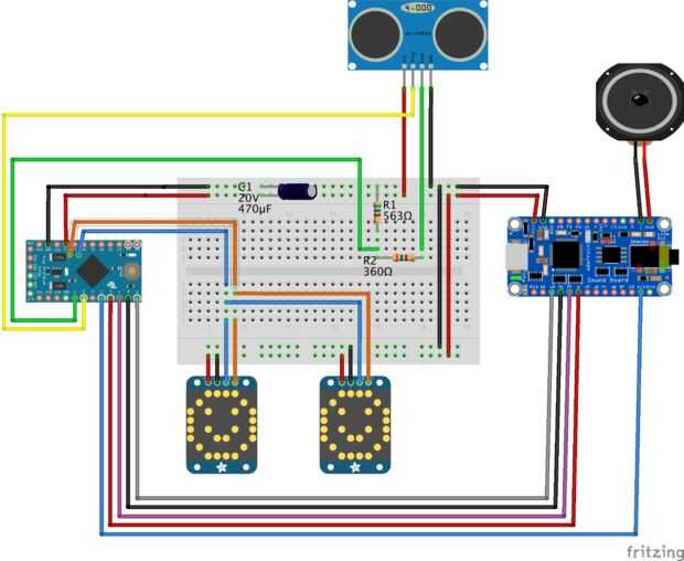 Las dos resistencias protegen el circuito de una señal de que no regrese. Originalmente había construido el circuito del sensor de alcance de RaspberryPi y tuvo guardado el diseño. La función pulseIn() de Arduino también acepta un tiempo de espera así que básicamente que el circuito funcionaría sin las resistencias.