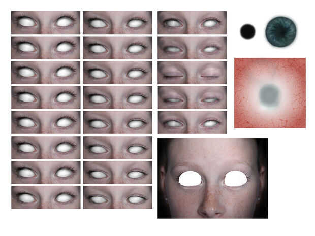 Las pantallas que ven abajo son todas las imágenes usadas. Los 16 cuadros de la izquierda son el movimiento horizontal de la tapa y 5 cuadros grandes son el parpadeo de rutina. El cuadro es el fondo y detrás de él, pupila, iris, Fondo de ojo.