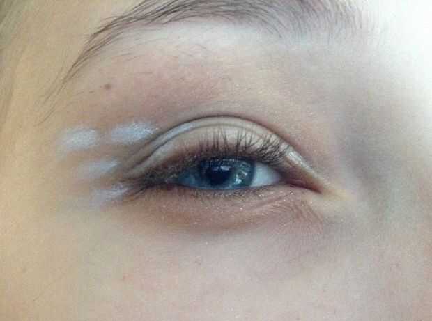 Utilizar un lápiz de ojos blanco y un pincel liner angular para hacer formas ovaladas por el borde exterior del ojo.