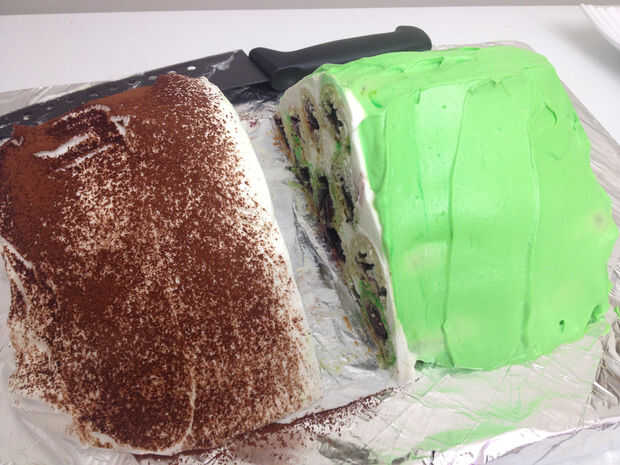 Difundir algunas crema batida en un plato y coloque 4 rollos. Crema de propagación en los rollos y pila 3 rollos por encima de él, luego crema, 2 rollos, luego crema y último rollo. Están creando una forma piramidal.