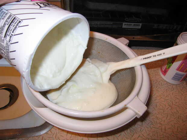 Poner el yogur en un colador. Romper como se saca del recipiente. Esto ayuda al líquido a drenar más fácil que dejarlo en un bloque grande.