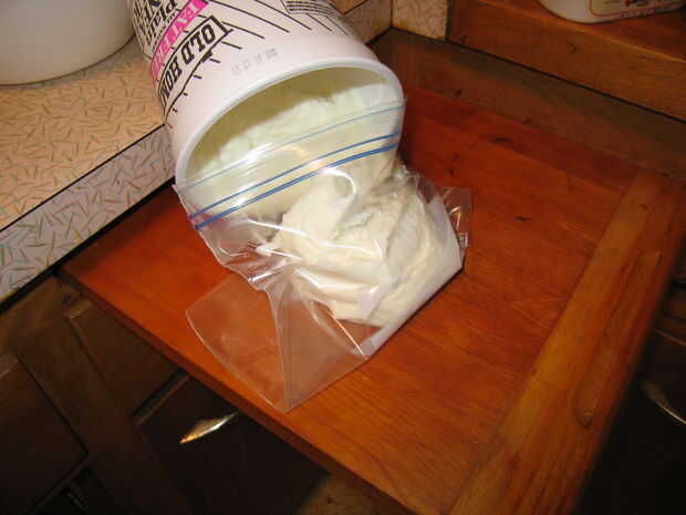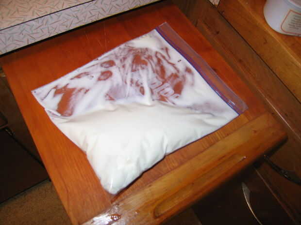 Descarga el yogur en la bolsa. Si desea un sabor más dulce, este es el momento de añadir que la descremada leche condensada azucarada. Tenga en cuenta que esto fina la consistencia un poco. Me encontré con este último lote, el contraste de la tarta dulce es mejor sin ella y es más fácil hacer una presentación de mejor aspecto.